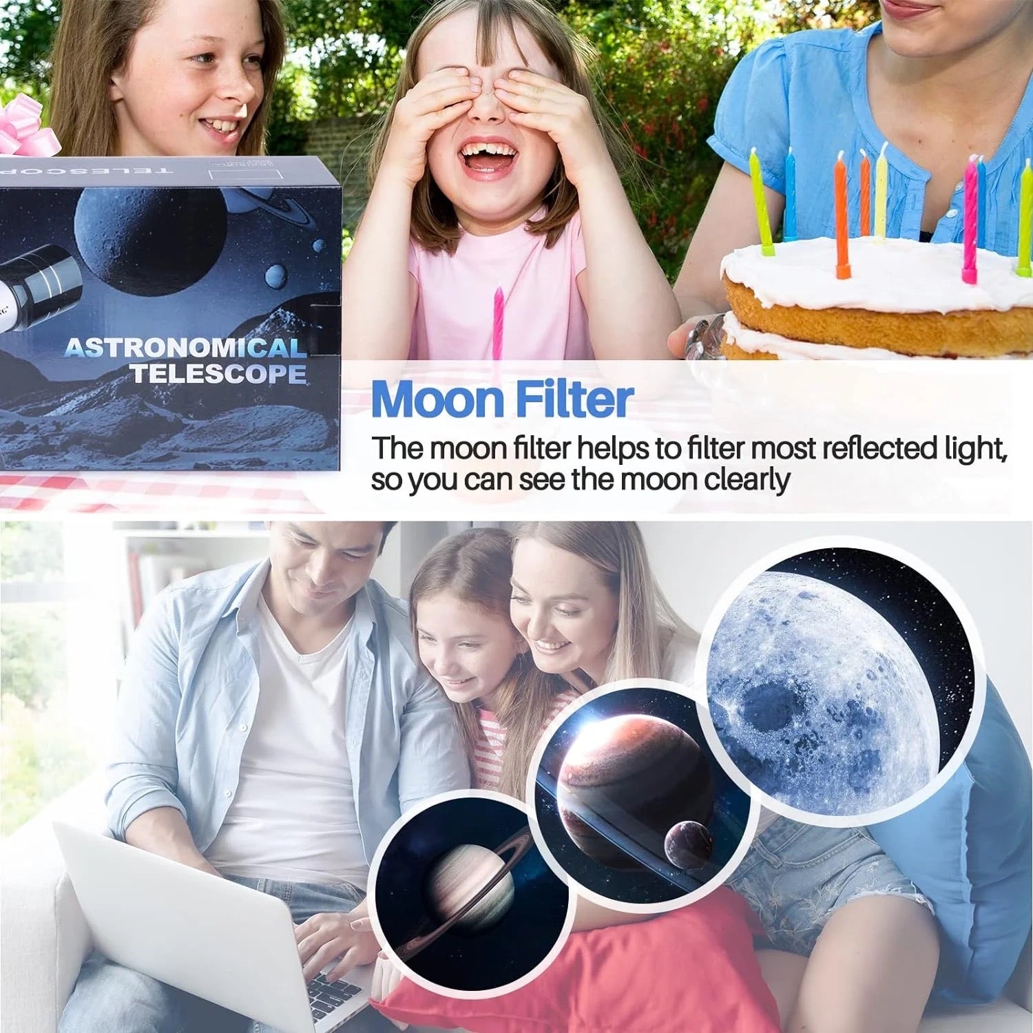 【70mm Large Lens】This astronomical telescope is equipped with a large 70mm lens covered with an FMC lens. It enhances light transmittance and reduces the light source loss rate, which make the image you see through the telescope brighter and clearer.