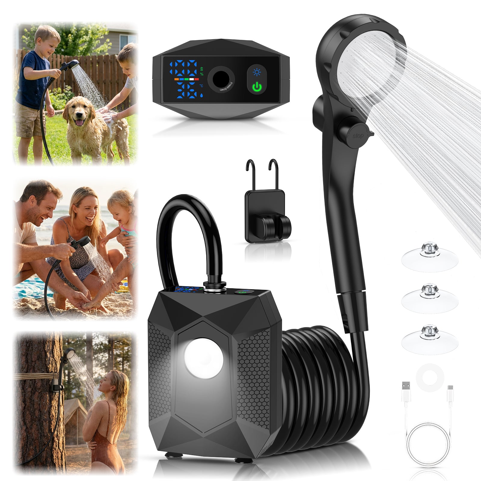 - UP TO 130-MINUTE RUNTIME: Portable shower is equipped with a large 6000mAh battery, providing 55 to 130 minutes of continuous use. It is perfect for camping, beaching, car washing, pet bathing, or gardening. In case of a home power outage, camping shower can also serve as an emergency water pump.