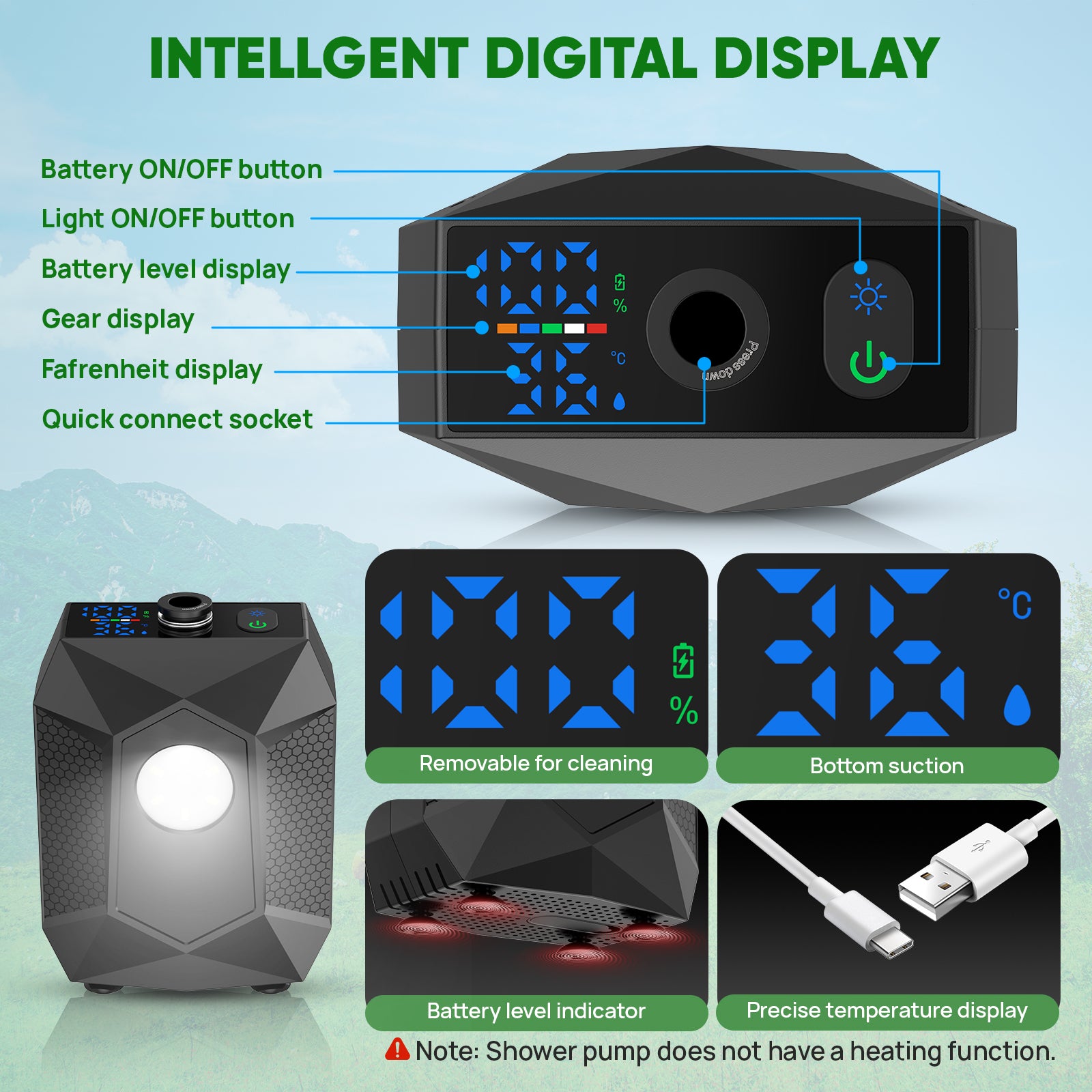 - WATER TEMPERATURE & BATTERY DISPLAY: Portable shower for camping has clear LED screen. It shows real-time water temperature (50°F-122°F) and exact battery percentage. Check temperature to avoid burns. Watch battery to plan use and avoid camping shower from shutdown. (Pump has no built-in heater).