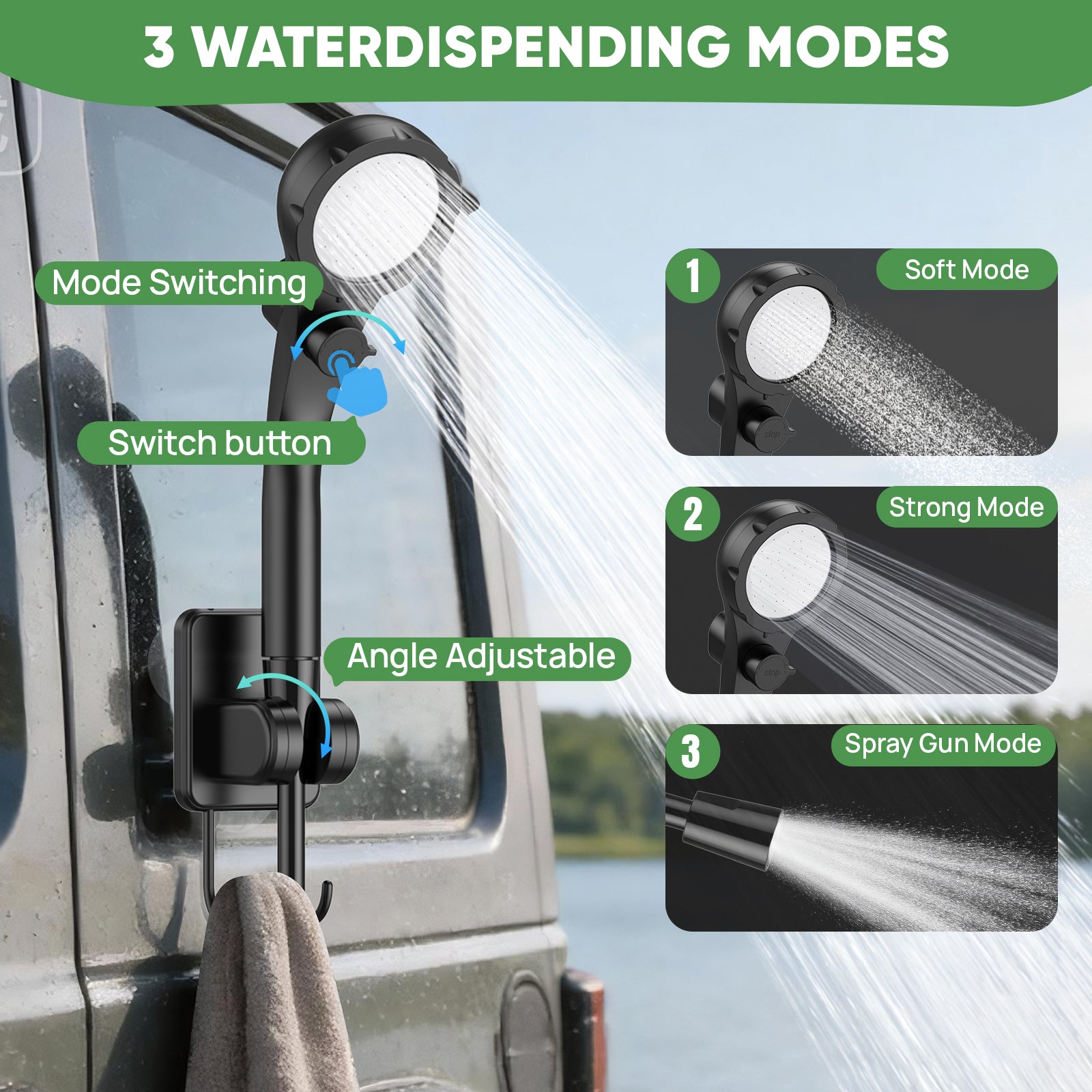- THREE SPRAY MODES: Get a gentle mist or strong spray from the portable shower head. Switch to the pressure jet for tough jobs like cars washing and dirty paws cleaning. Need to rinse off after a hike? The camping shower mode does it all.