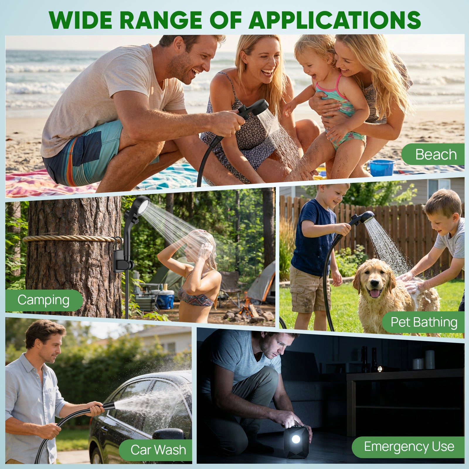 - WIDE RANGE OF APPLICATIONS: The Portable camping shower works for camping, beaching, car washing, pet cleaning, garden watering, home water outage, and emergency prep. Enjoy the freedom of strong, instant water flow without needing an outlet or hose.
