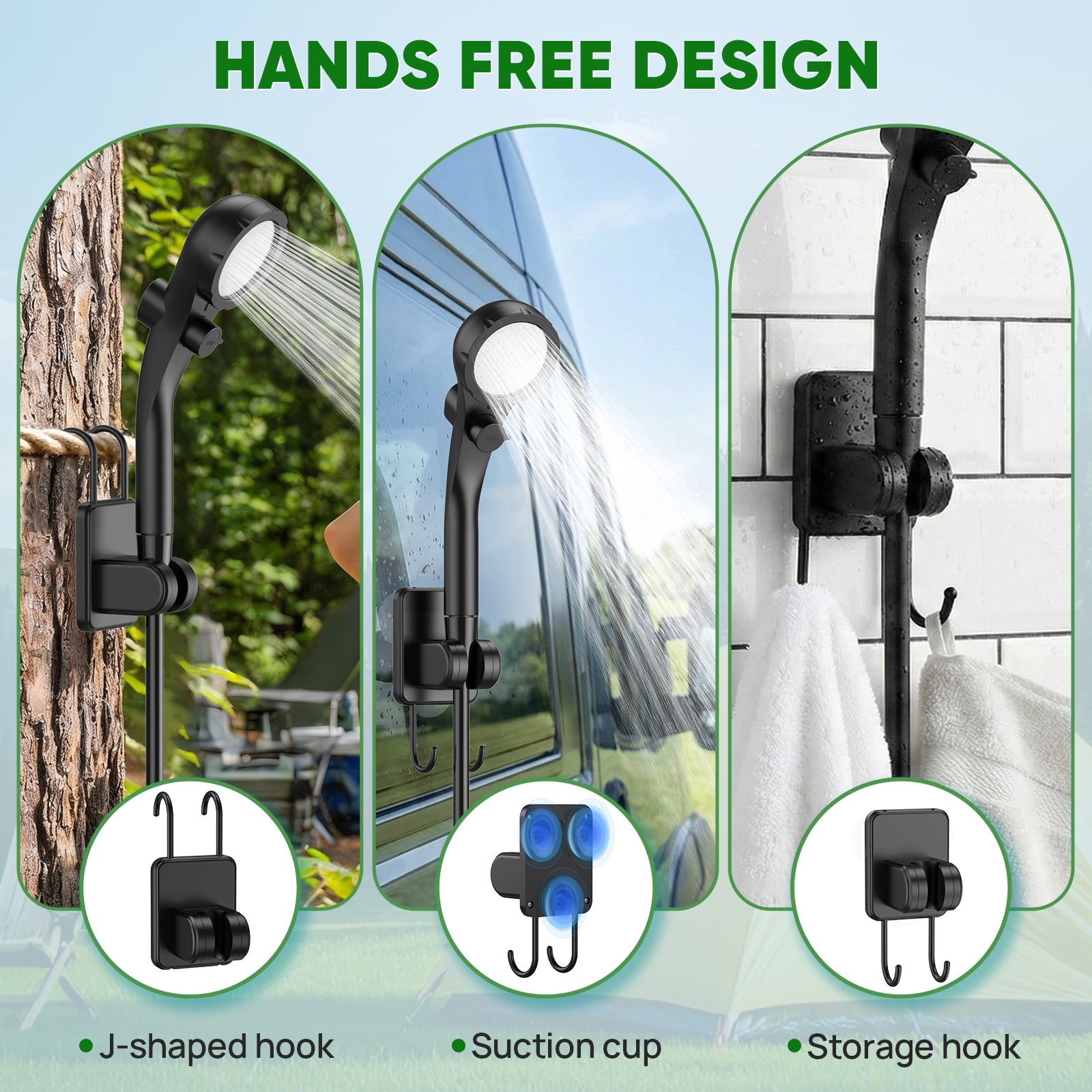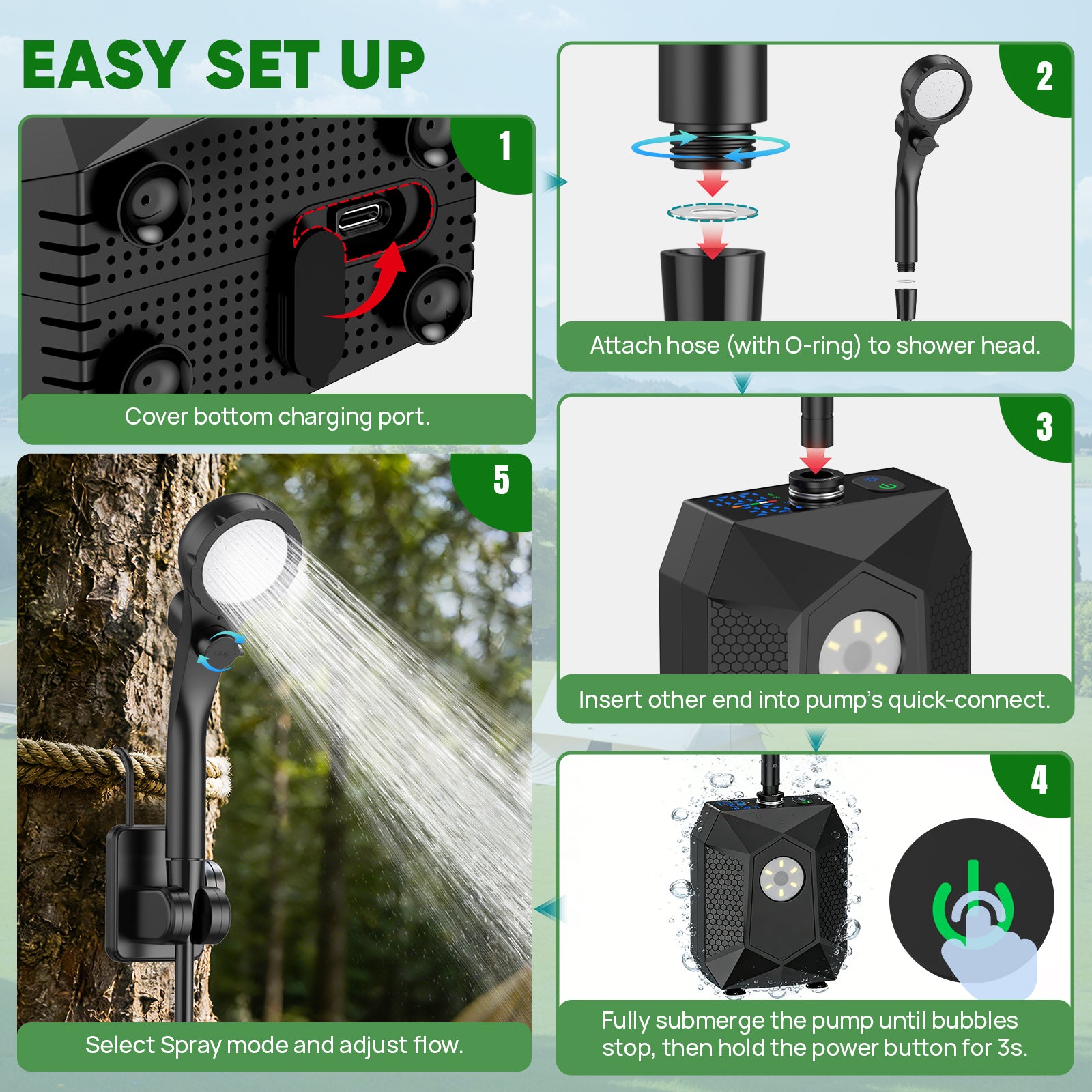 - EVERYTHING YOU NEED IN THE BOX: Portable shower kit has pump, shower head, 78.47in(2m) hose, hook, storage bag and USB-C cable. Charge it fully before first use. A very useful camping shower and perfect gift for outdoor lovers, drivers, pet owners, or safety-focused families.