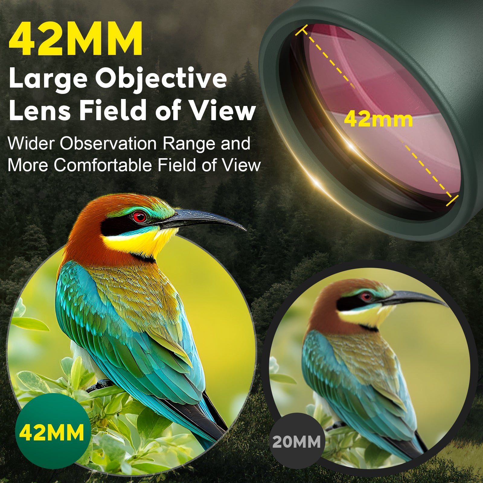 【10x42mm HD Binoculars】 Featuring 10X magnification and a 42mm objective lens, these binoculars deliver crisp, detailed views. With a wide 168ft/1000yds field of view, the binoculars are ideal for bird watching, hunting, sports, mountain trips, cruises, and travel.