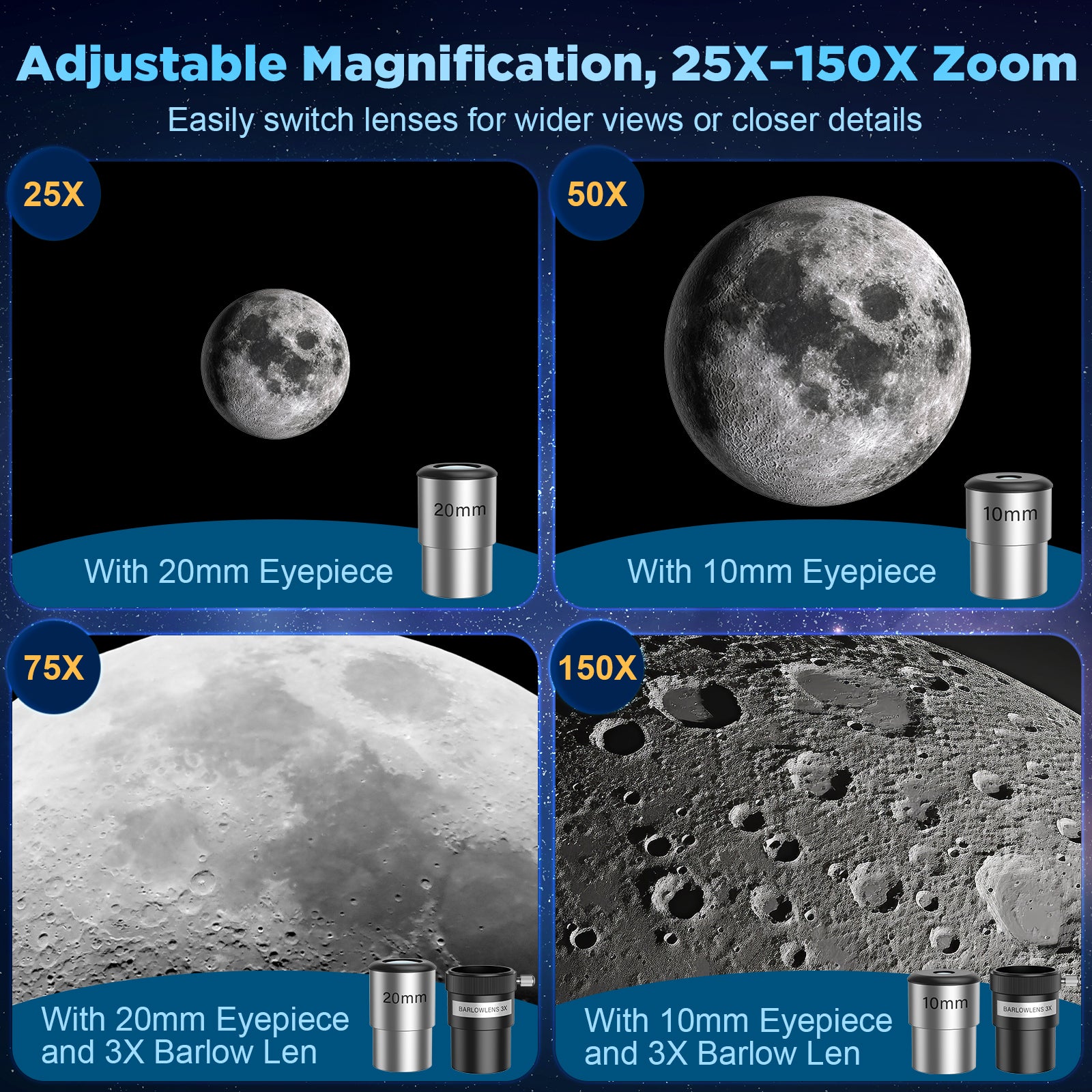 【VERSATILE MAGNIFICATION KIT】This portable telescope comes bundled with a K20 mm (25×) eyepiece, K10 mm (50×) eyepiece, and 3× Barlow lens (extending up to 75× and 150×), giving reliable zoom flexibility without extra purchases—ideal for users seeking a portable telescope that works right out of the box, from casual moon gazing to enhanced planetary detail.