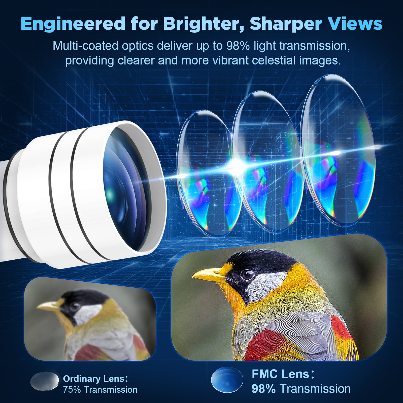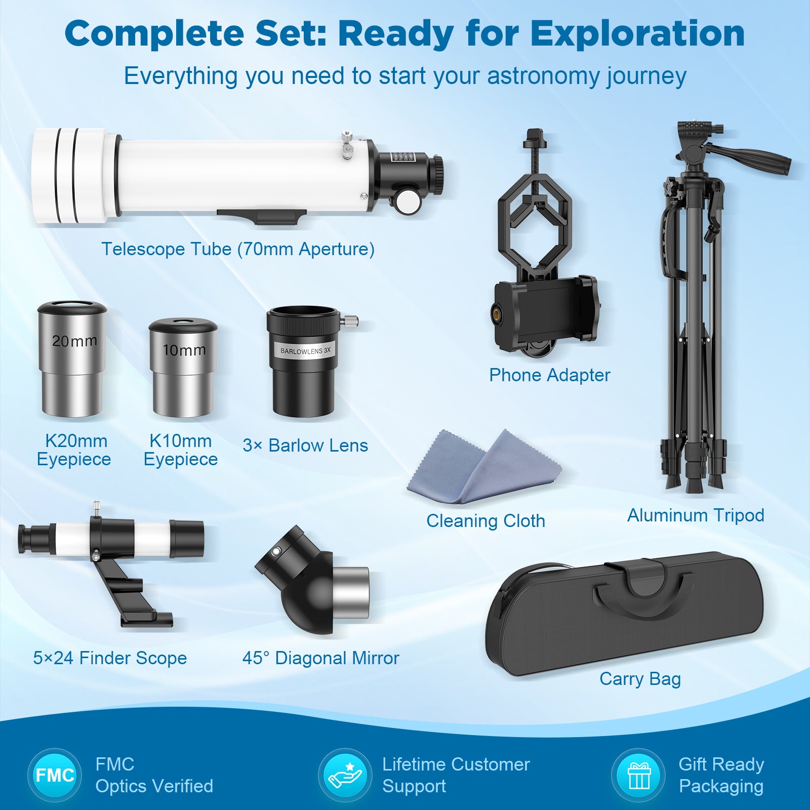 【OPTICS POWER & CLARITY】Equipped with a 70 mm aperture and 500 mm focal length, this telescope for beginners delivers bright, crisp lunar and planetary views. With FMC fully multi-coated optics, this astronomical telescope enhances contrast and clarity, revealing lunar craters and star clusters invisible to basic scopes.