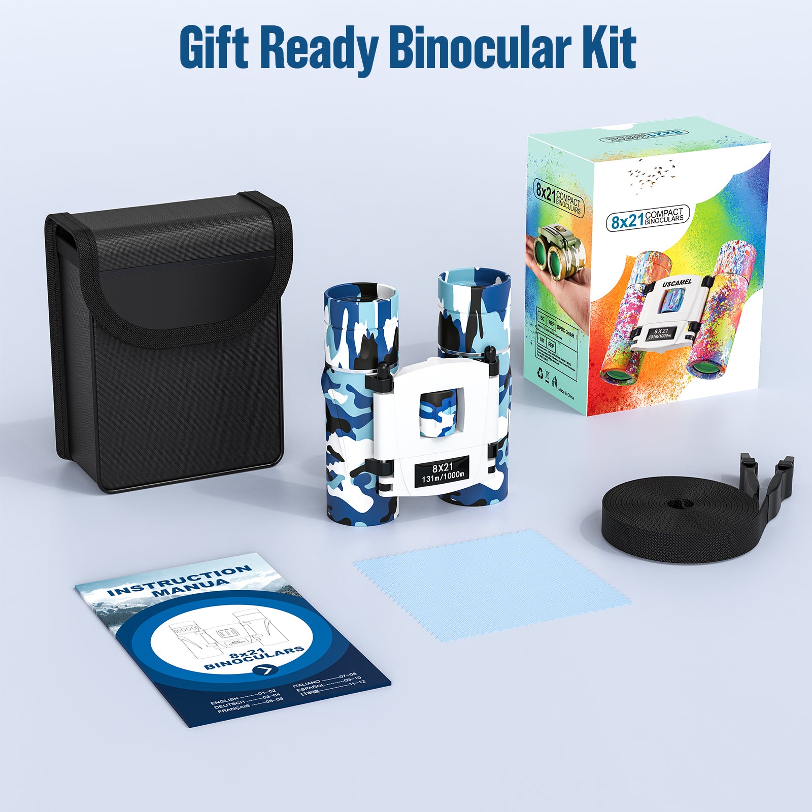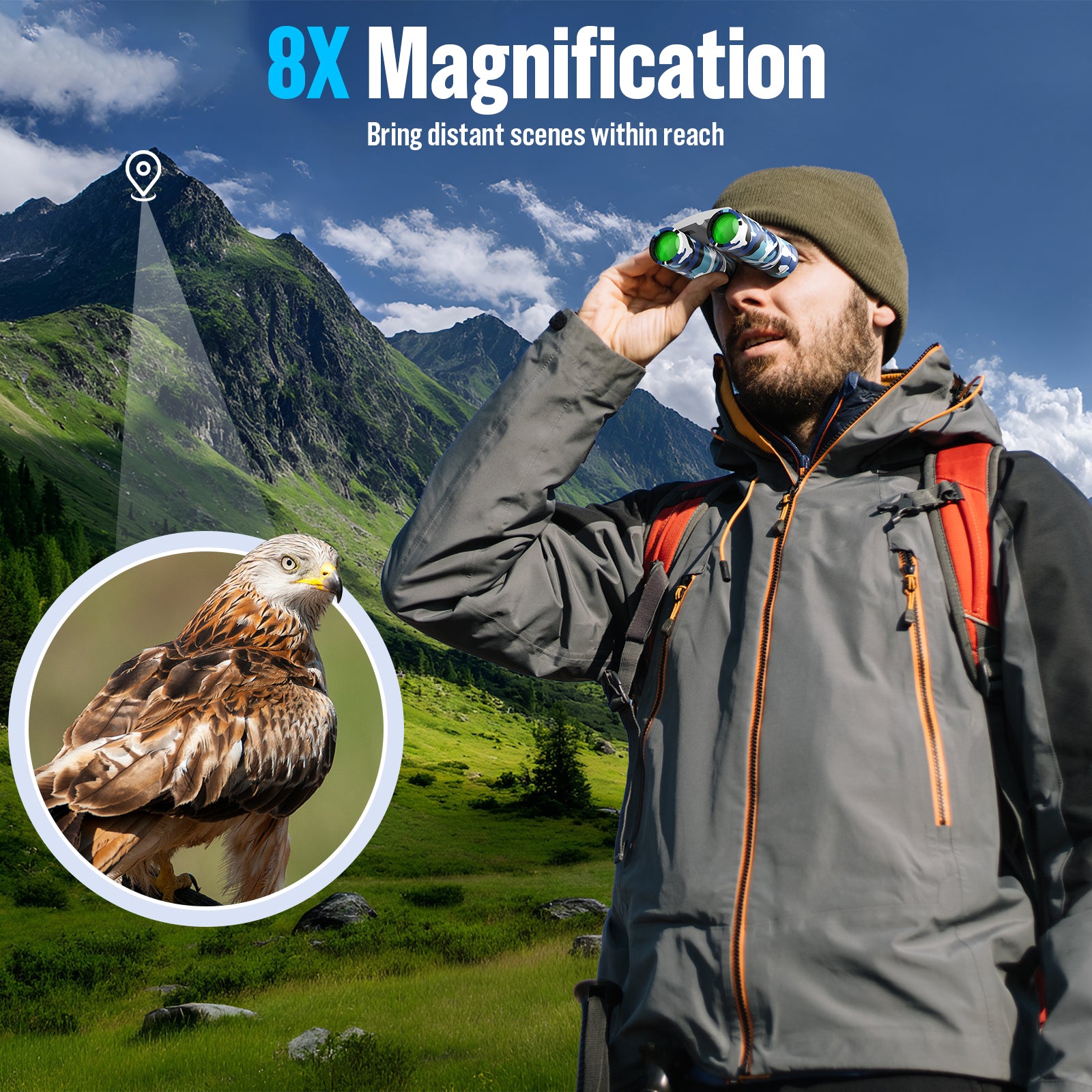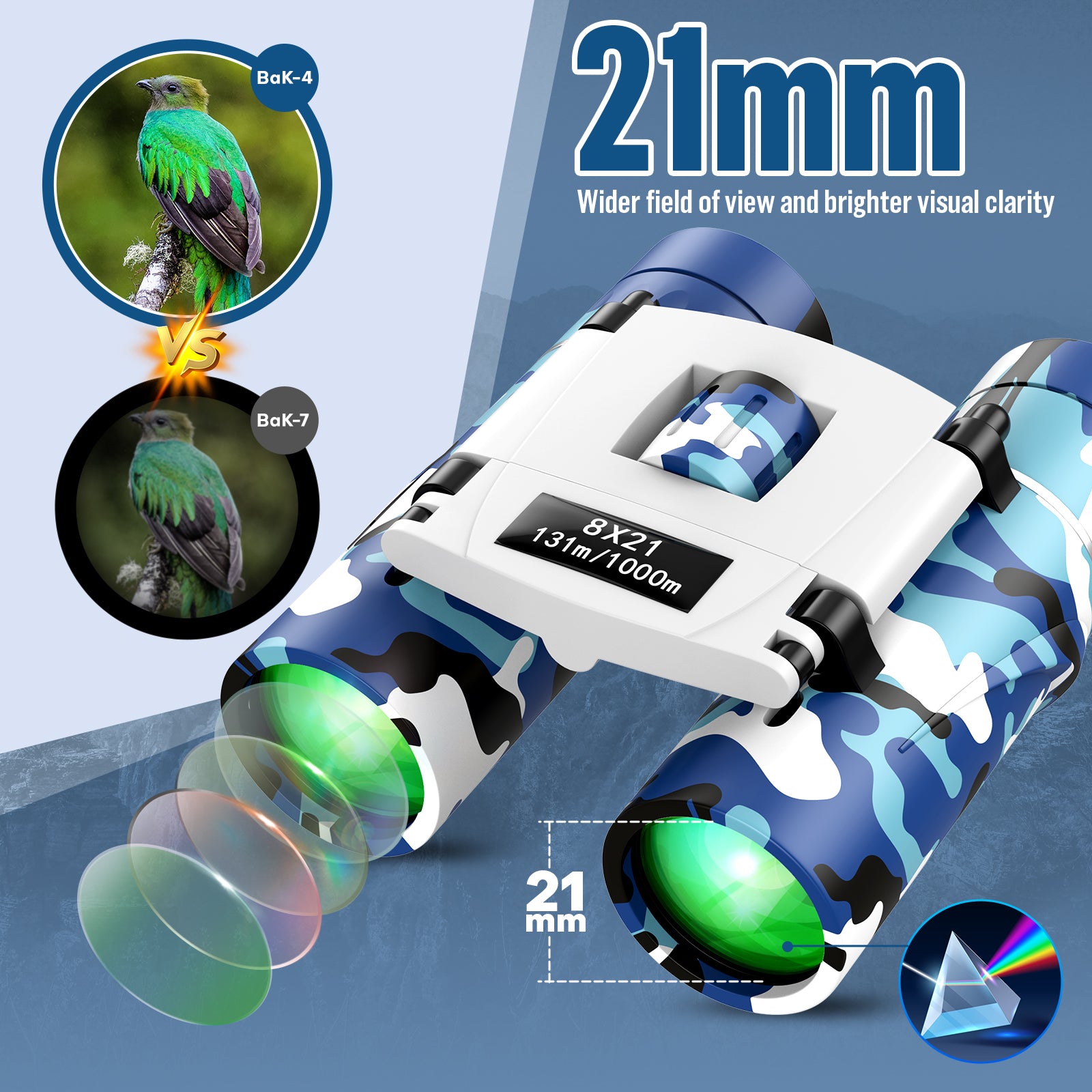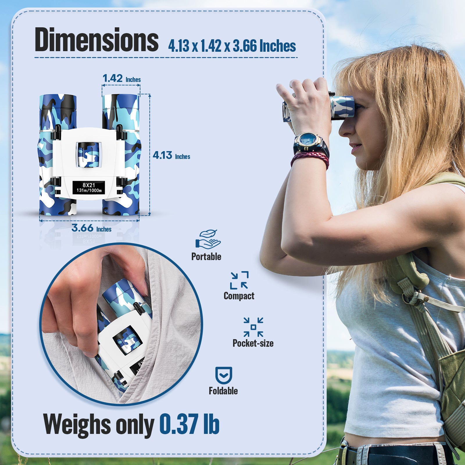QUNSE 8×21 Mini Pocket Binoculars, Compact Binoculars for Kids and Adults, Ideal for Bird Watching, Travel, and Hunting, Great Gift for Boys and Girls (Blue and white)