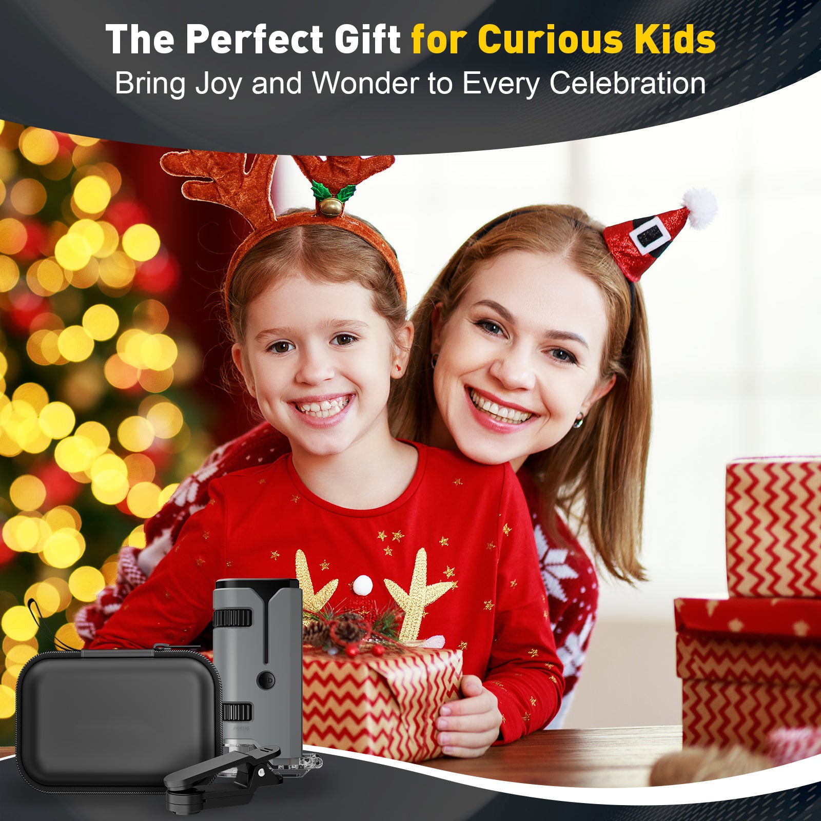 【PORTABLE DESIGN FOR ANY ADVENTURE】At just 0.17 lb and 2 × 1 × 4 in, this portable microscope fits easily into any pocket or backpack. Durable ABS shell and ergonomic grip make it ideal for school projects, camping trips, or travel—an all-ages kids microscope that turns every walk into a scientific journey.