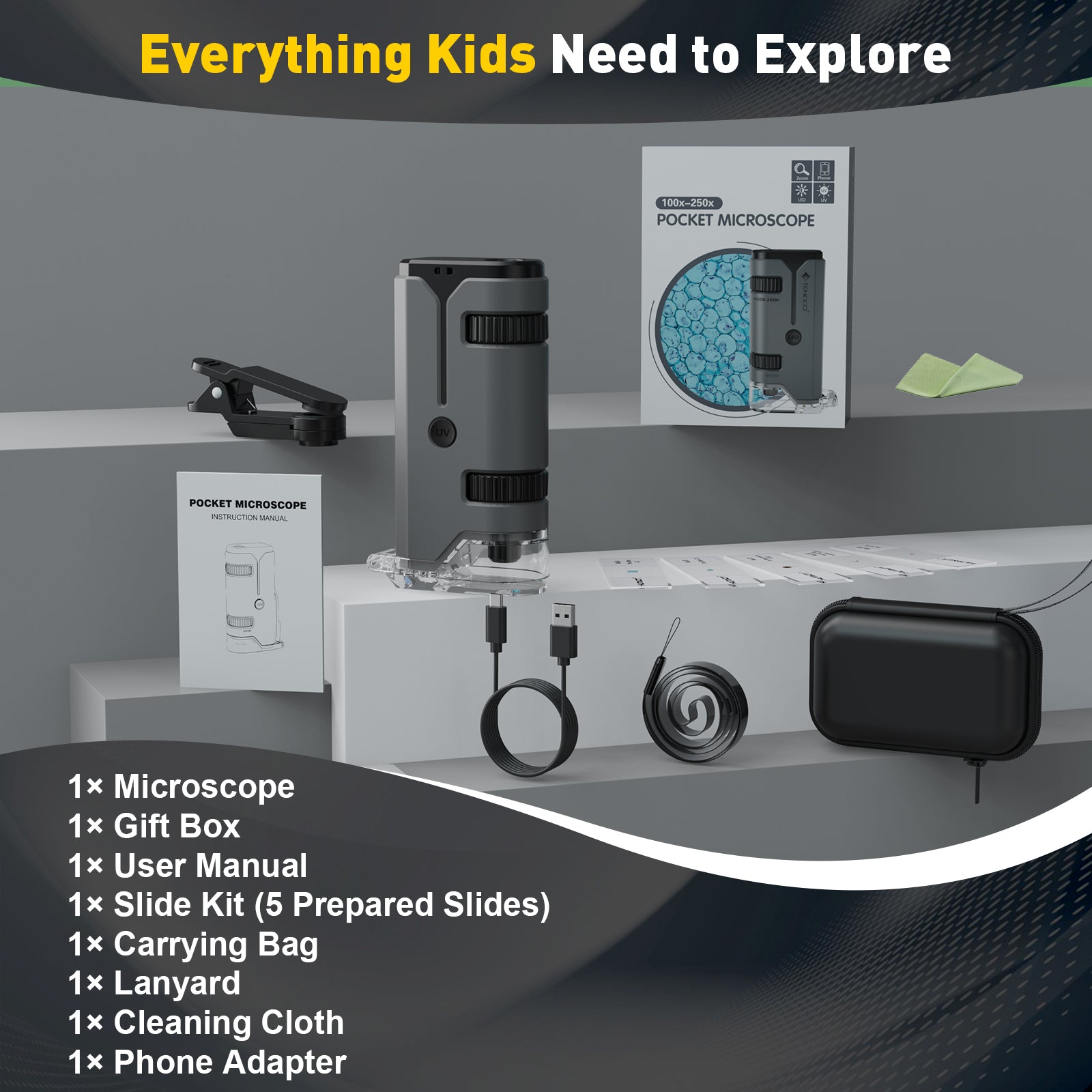 【READY-TO-USE COMPLETE SCIENCE KIT】This portable microscope set includes 5 prepared slides, a phone adapter, EVA box, wrist strap, and manual—everything ready for instant exploration. Powered by one AA battery (not included), this handheld microscope inspires effortless discovery for home or classroom use.